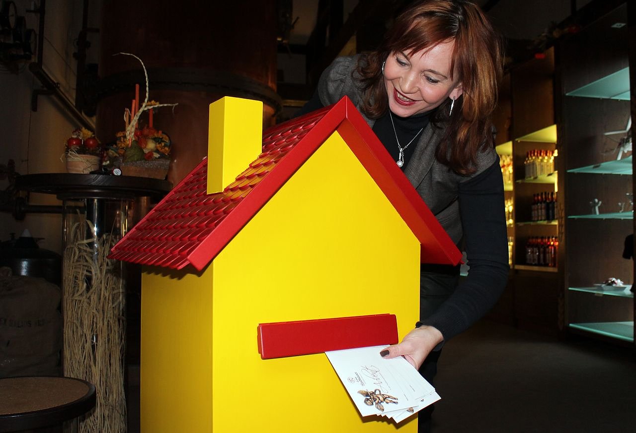 Daniela Külbel, Mitarbeiterin in der Echter Nordhäuser Traditionsbrennerei, macht es vor. Hier können die Briefe mit den Weihnachtswünschen eingeworfen werden