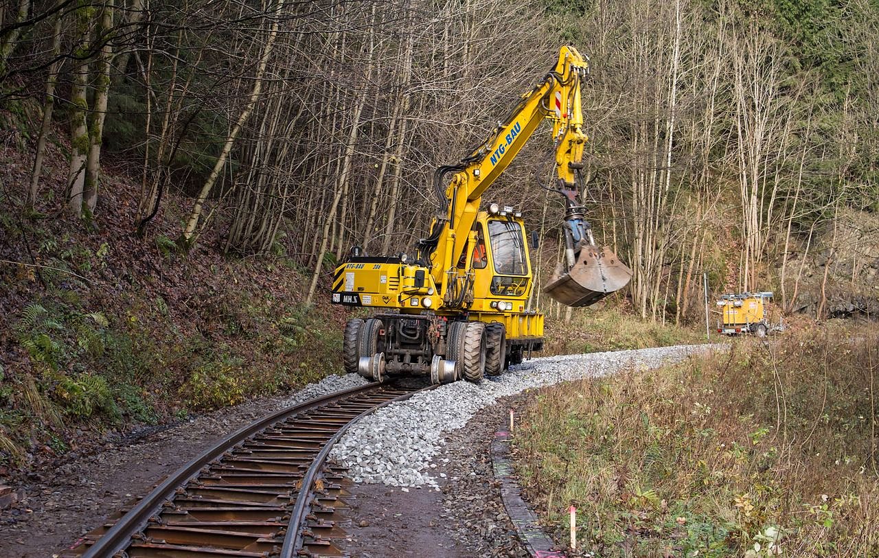 Autor: redGleisbauarbeiten im Behretal bei Eisfelder Talmühle – Ein spezieller Schienenbagger füllt das neu verlegte Gleis mit Schotter auf.