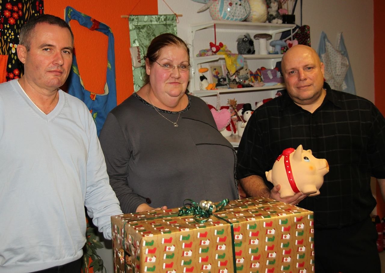 Autor: redGeschäftsführer Heiko Röder und der Personalratsvorsitzende Udo Volland überreichten Christine Telemann, der Leiterin der Nordhäuser Beratungsstelle, gestern zur Kinderweihnachtsfeier des Vereins die gesammelten Sach- und Geldspenden. Der Verein Thüringer Arbeitsloseninitiative - Soziale Arbeit betreut im gesamten Freistaat kostenfrei Hilfesuchende.