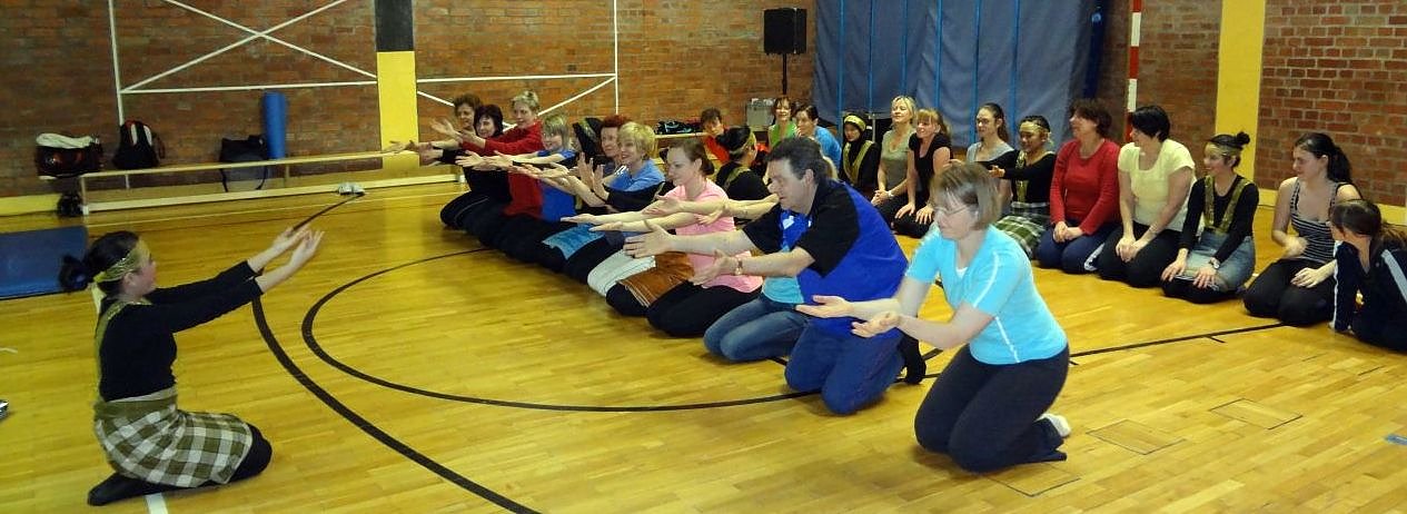 Geleitet von der sympathischen Frontfrau Chiquita Hanindya, die mit ihrem kräftigen "Its" die Kommandos und den Ton angab, sangen und tanzten die Indonesierinnen vor dem interessierten Publikum der Damen des Karatevereins. Aber dies war nur der Auftakt zu dem nun folgenden gemeinsamen Einstudieren der einzelnen Tanzelemente. Vor allen Koordination und Rhythmus waren gefragt, um auf keinen Fall aus dem Takt zu kommen.
