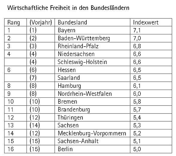Wie im Vorjahr führt Bayern vor Baden-Württemberg den Vergleich der Länder an. Die wirtschaftliche Freiheit in den ostdeutschen Ländern ist im Durchschnitt nach wie vor geringer als in den alten Bundesländern, vor allem deshalb, weil die Staatstätigkeit in den neuen Ländern, gemessen an der vergleichsweise niedrigen Wirtschaftsleistung, erheblich größer ist.