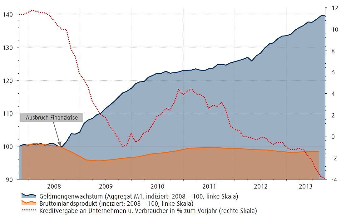 Zwar zeigen sich nach wie vor strukturelle Defizite und ökonomische Leistungsunterschiede zwischen den süd- und den nordeuropäischen Staaten, die vorgenommenen Maßnahmen jedoch zeigen erste Wirkungen. Viele Maßnahmen waren jedoch nur durch die Ausweitung der Geldmenge durch die EZB möglich. Einziger Wehrmutstropfen ist die rückläufige Kreditvergabe, denn diese bremst neuere Investitionen und damit womöglich auch das künftige Wirtschaftswachstum.