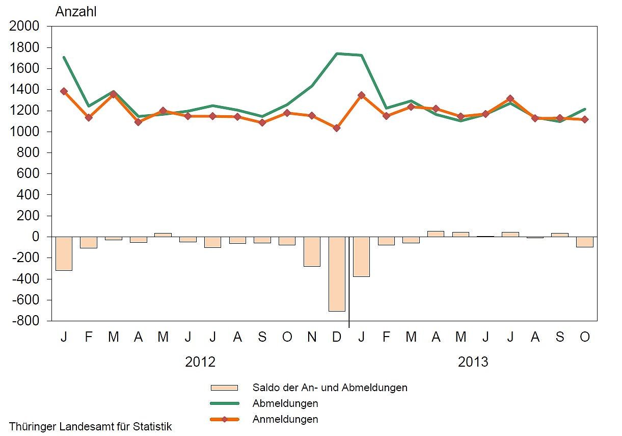 Die Anzahl der Anmeldungen stieg nach Mitteilung des Thüringer Landesamtes für Statistik um 90 bzw. 0,8 Prozent auf 11 942 Anzeigen. Mit 12 387 Anzeigen ging die Anzahl der Gewerbeabmeldungen um 298 Anzeigen bzw. um 2,3 Prozent zurück. Auf 100 Anmeldungen kamen 104 Abmeldungen. Im Vergleichszeitraum des Vorjahres waren es 107 Abmeldungen.