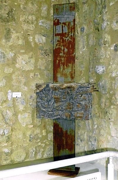 Zurück zum Petriturm! Eine senkrechte Stahlstele symbolisiert das Neue, die gestaltete Horizontale, aus Blech geschmiedet, das Inferno. Beide Teile sind mit grauer Zinkfarbe bestrichen. Das verbindende Element zwischen dem Zerstörten und dem Aufgebauten ist eine Pflanze.