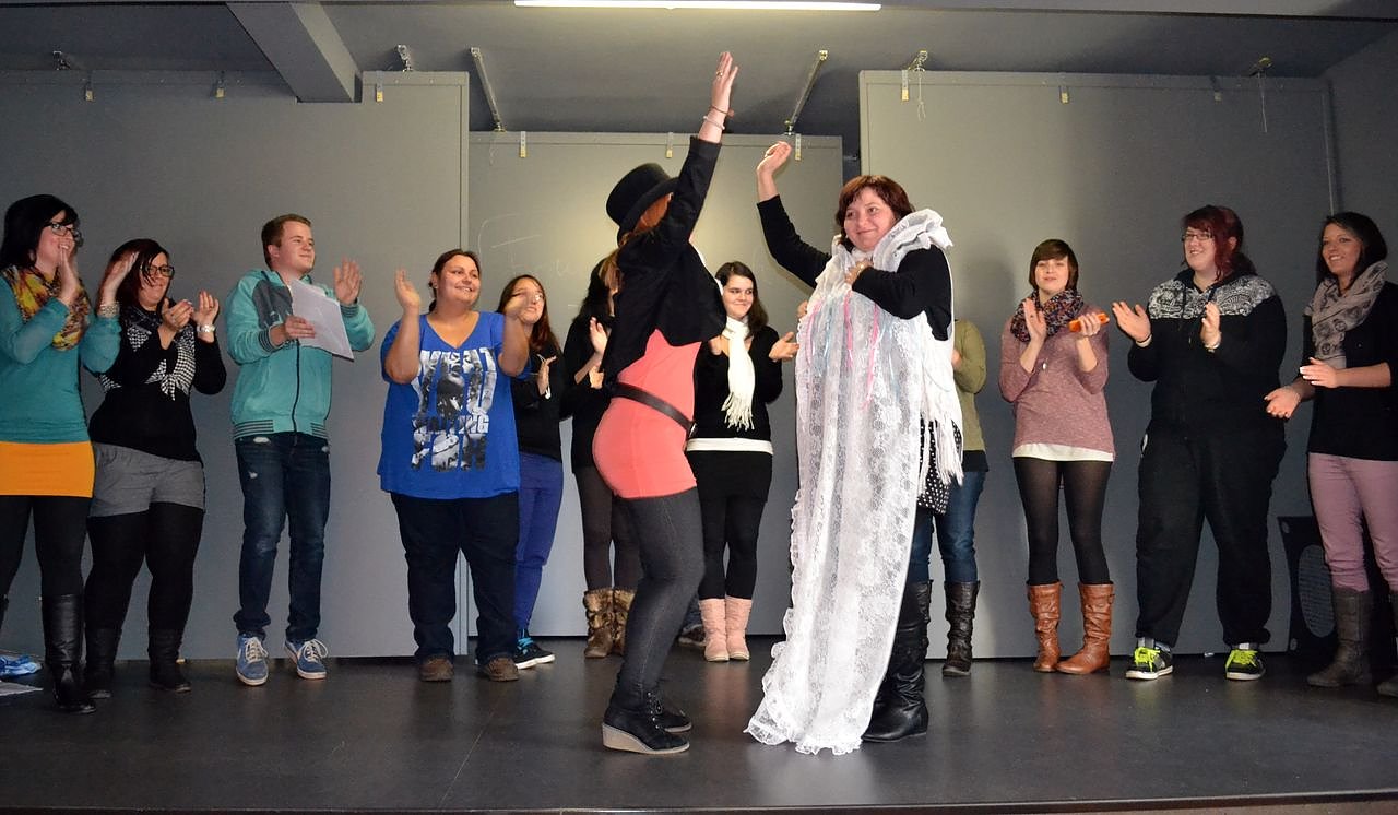 Probenszene "Zwischen Klassen-) Raum und Zeit" mit den zukünftigen Sozialassistenten.