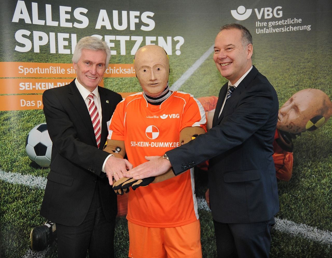 Autor: redEugen Gehlenborg (l.), DFB-Vizepräsident und Präsident des Norddeutschen Fußball-Verbands, und Prof. Bernd Petri (r.), Mitglied der VBG-Geschäftsführung, geben gemeinsam mit der Kampagnenfigur Dummy den Startschuss für die VBG-Präventionskampagne Sei kein Dummy!..