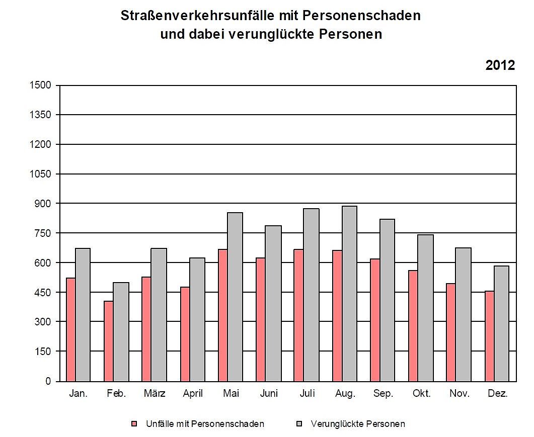 Bei den 481 Verkehrsunfällen mit Personenschaden verunglückten 653 Personen. Davon wurden 10 Menschen getötet, 3 mehr als im November 2012. Es wurden 643 Personen verletzt, davon 129 schwer und 514 Personen leicht. Im Vergleich zum Vorjahresmonat ist die Zahl der Verletzten um 25 Personen bzw. 3,7 Prozent gesunken.