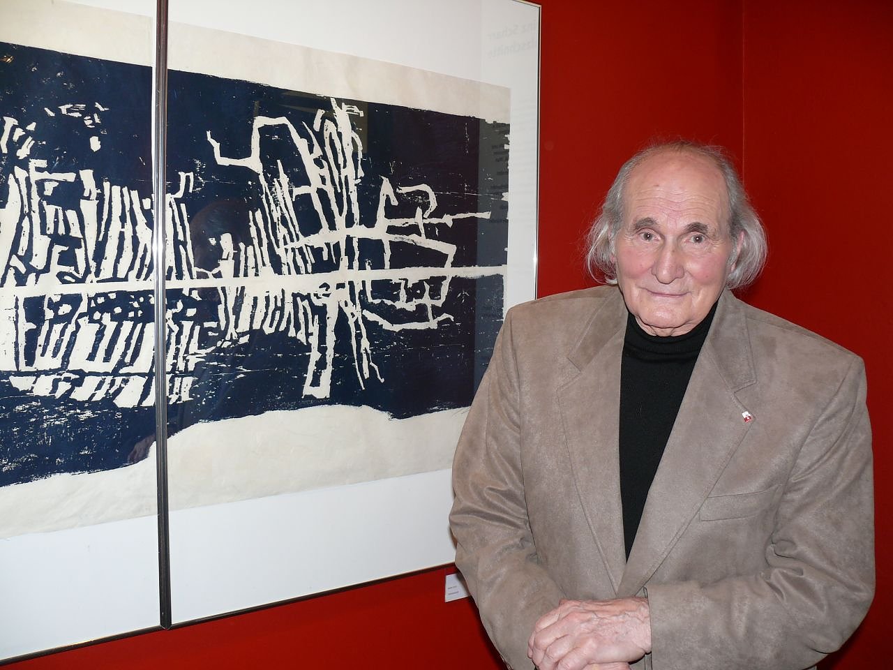 Heinz Scharr vor seinem zweiteiligen Werk Moby Dick im Kunsthaus Meyenburg zur Vernissage.