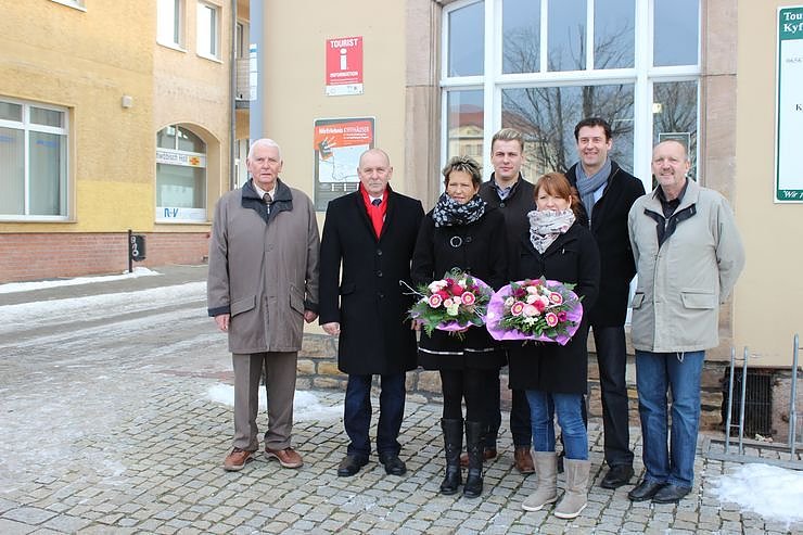 Vor der wiedereröffneten Touristinformation versammelten sich Hans Naumann (Stellvertreter des Vorsitzenden des Verwaltungsrats der Kurgesellschaft Bad Frankenhausen, Dr. Andreas Räuber ( Vorsitzenden des Verwaltungsrats der Kurgesellschaft) , Katrin Möbius (Mitarbeiterin Touristinformation), Bürgermeister Matthias Strejc, Susann Raich (Auszubildende), Thomas Knorr (Geschäftsführer der Kurgesellschaft) und Blumentritt (Betriebsleiter der Kyffhäusertherme)am Vormittag.