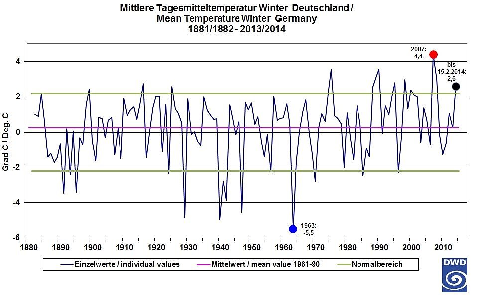 Eine bisherige Bilanz dieses meteorologischen Winters offenbart, dass die mittlere Temperatur im deutschlandweiten Flächenmittel bei etwa 2,6 Grad lag (Stand: 15. Februar 2014). Der Durchschnitt in der Referenzperiode der Jahre 1961 bis 1990 liegt jedoch nur bei 0,2 Grad, womit es aktuell im Mittel 2,4 Grad wärmer ist.