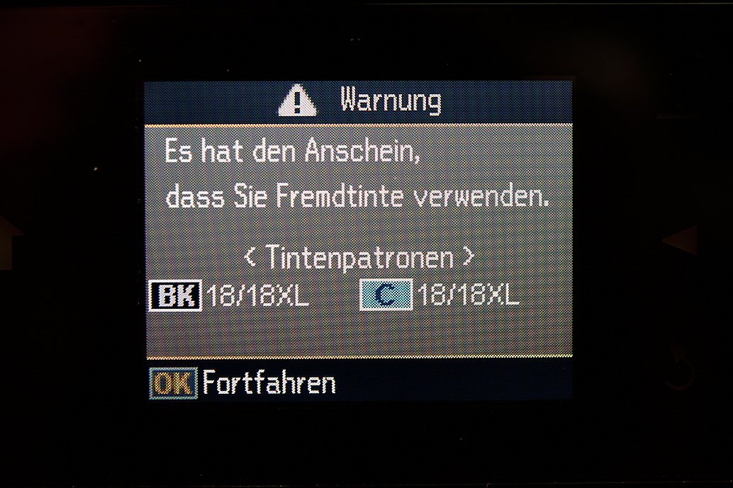 Warnung!, Betrugsverdacht die Nutzer von Fremdtinten sollten sich von solchen Hinweisen der Drucker nicht verunsichern lassen. Mit einem Wechsel können sie richtig viel Geld sparen. Im Extremfall kostet der Druck einer DINA4-Farbseite nur noch 5 Cent statt 1,50 Euro...
