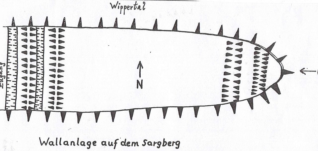 Auf dem östlichen Ausläufer des Bergrückens des Sargberges liegt eine erst 1986 vom Kreisbodendenkmalspfleger Peter Steinhardt bei einer Flurbegehung entdeckte Wallburg. Die vom Museum in Weimar unter Schutz gestellt wurde. Denn Bodendenkmale sind wichtige Zeugen der Vergangenheit. Der natürliche Zugang der Burganlage befindet sich auf der Westseite des Bergsporns. Die fast ebene Burgfläche sowie der Kamm des Sargberges bestehen aus Schichten des Unteren Muschelkalkes.