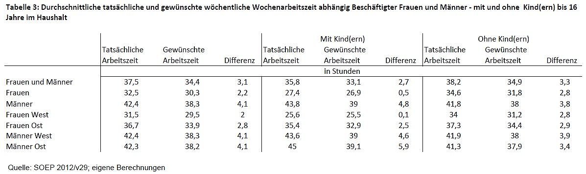 Auf die Frage, wie viele Stunden sie - ohne Lohnausgleich - gerne arbeiten würden, wenn sie den Umfang ihrer Wochenarbeitszeit selbst wählen könnten, gaben Frauen im Jahr 2012 eine gewünschte durchschnittliche Wochenarbeitszeit von 30,3 Stunden an. Damit lag ihre Wunscharbeitszeit durchschnittlich 2,2 Stunden unter ihrer tatsächlichen Arbeitszeit; bei den Männern betrug die Differenz sogar 4,1 Stunden bei einer gewünschten durchschnittlichen Wochenarbeitszeit von 38,3 Stunden.