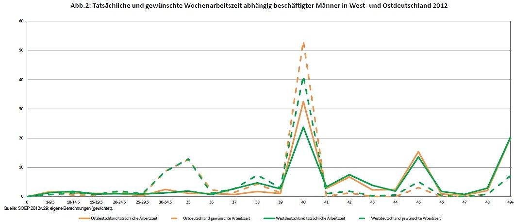 42 Prozent der ostdeutschen und 30 Prozent der westdeutschen abhängig beschäftigten Frauen wünscht sich eine Arbeitszeit von 30 bis 35,5 Stunden. 39 Prozent der ostdeutschen und 25 Prozent der westdeutschen Frauen würden gerne 38 bis 40,5 Stunden in der Woche arbeiten. Vor allem westdeutsche Frauen (23 Prozent) wünschen sich eine Arbeitszeit von 20 bis 29,5 Stunden. Die Mehrheit der abhängig beschäftigten Männer präferiert hingegen eine Arbeitszeit von 38 bis 40,5 Stunden (Ost 59 Prozent, West 52 Prozent).