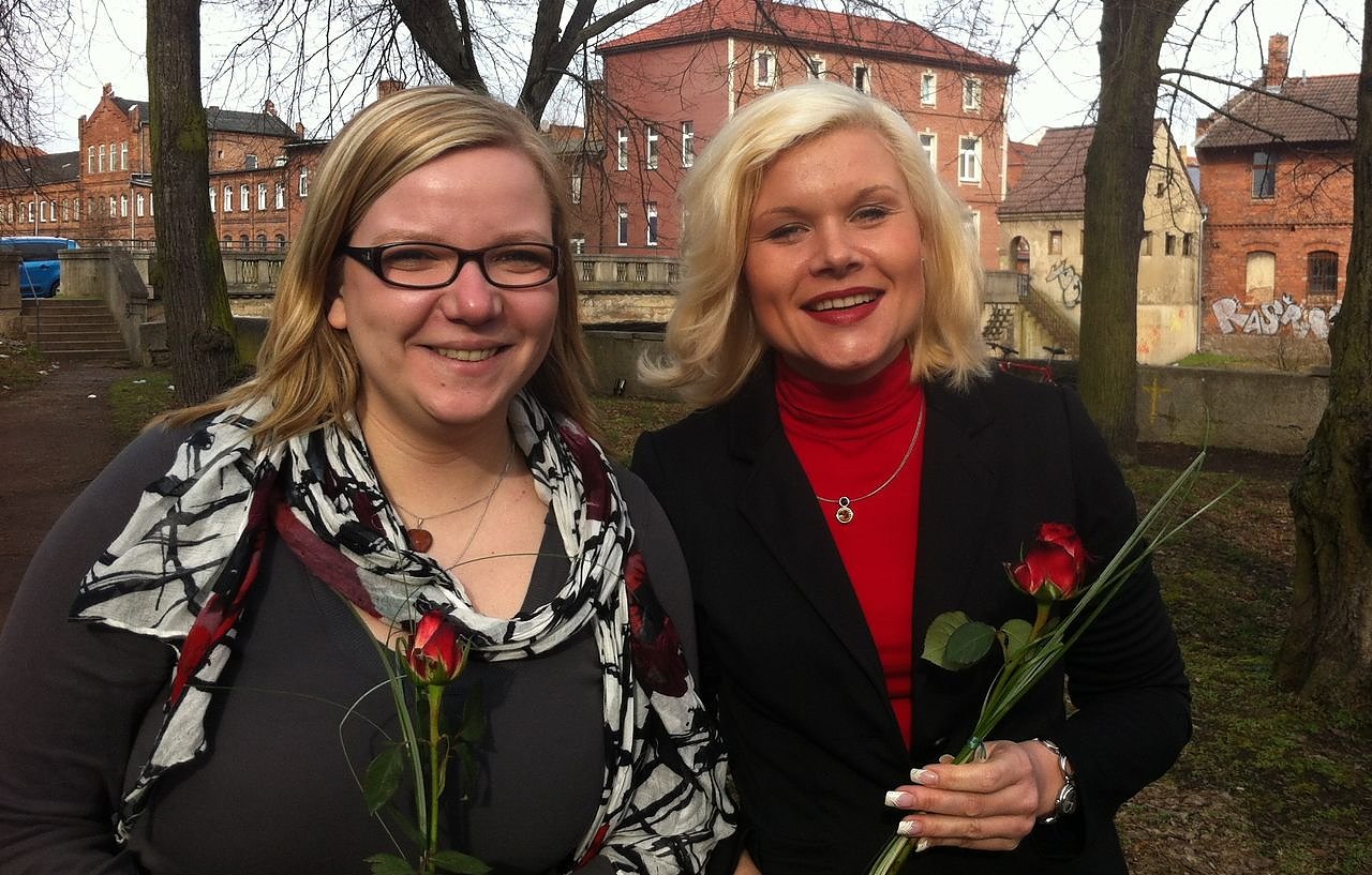 Hummitzsch und Mitteldorf besuchten am Freitag die Frauen des Kühlgeräterückwandherstellers BUNDY in Bleicherode und verteilten gemeinsam mit der Bundestagsabgeordneten Hupach Rosen zum Schichtwechsel. Den Ort hatte das Linke-Frauenteam bewusst gewählt. Nachdem bekannt wurde, dass ein Teil der Produktion ins Ausland verlagert wird, stehen die Beschäftigten von BUNDY einer Entlassungswelle gegenüber.