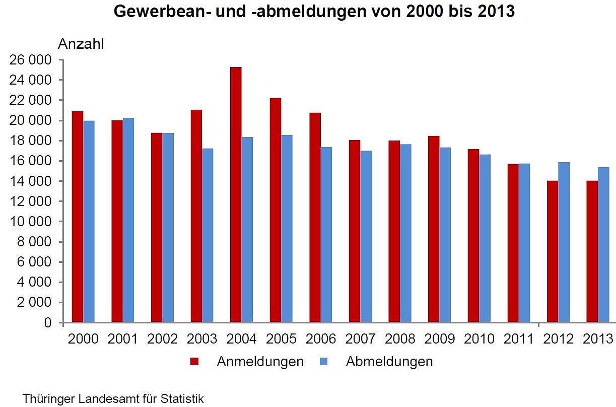 Nach Mitteilung des Thüringer Landesamtes für Statistik gab es im Jahr 2013 in Thüringen 14 038 Gewerbeanmeldungen, 2012 waren es 14 037 Anzeigen.