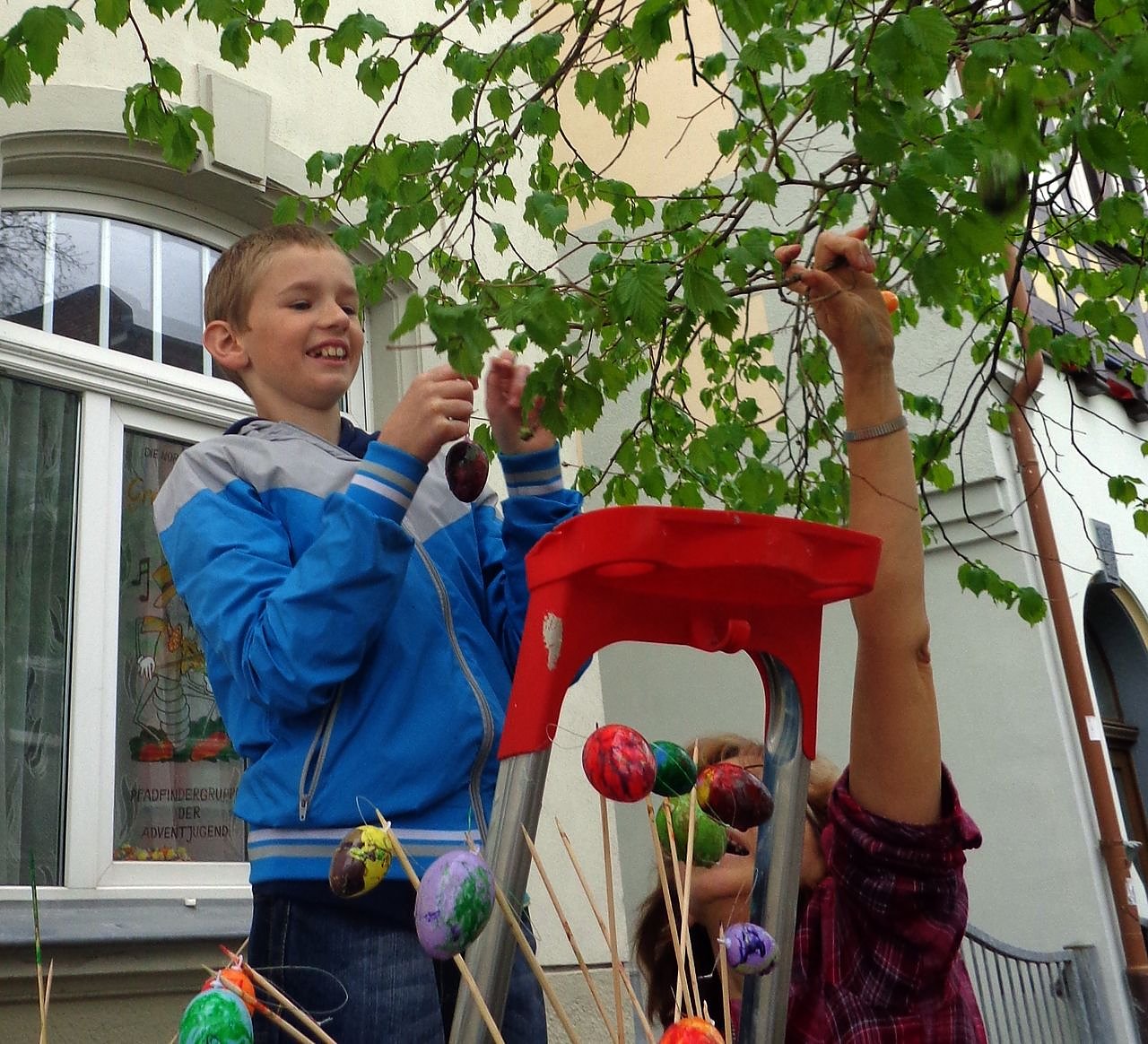 Im jüngsten Treffen wurden Ostereier bemalt und am Lindenbaum vorm Haus aufgehangen. Die Kinder hatten viel Spaß dabei und vielleicht erfreuen sich auch die Nachbarn und Passanten daran.