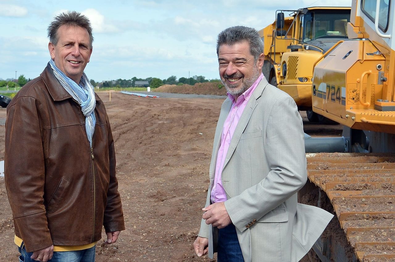 Über den zügigen Fortgang der Erdarbeiten zur infrastrukturellen Erschließung des Industriegebietes Goldene Aue informierten sich Andreas Wieninger und Manfred Breitrück (beide SPD) vor Ort...