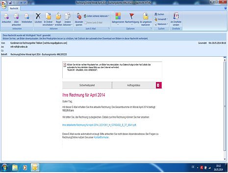Wie das zu erfolgen habe, werde in einem der Mail beigefügten Anhang genauer erklärt. Diese Abzockmasche ist bei der TELEKOM bekannt. Rechtliche Schritte sind eingeleitet. Darüber hinaus warnt die TELEKOM davor, den erwähnten Anhang zu öffnen. Ein darin versteckter Virus kann dazu führen, dass der jeweils betroffene Rechner Schaden nimmt. Wer solche Rechnungen in seinem Posteingang findet, tut gut daran, diese Mail ungeöffnet zu löschen.