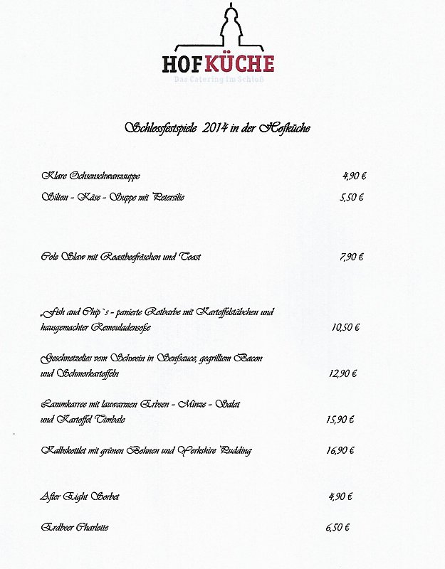 Während der Schlossfestspiele wird es veränderte Öffnungszeiten geben. So wird Samstag und Sonntag ab 11:00 Uhr geöffnet sein und am Freitag geht es ab 16:00 Uhr mit diesem Angebot los. Und auch vom Preisniveau her gibt es "nichts zu meckern" zumal man ja sein Menü zusammenstellen kann.