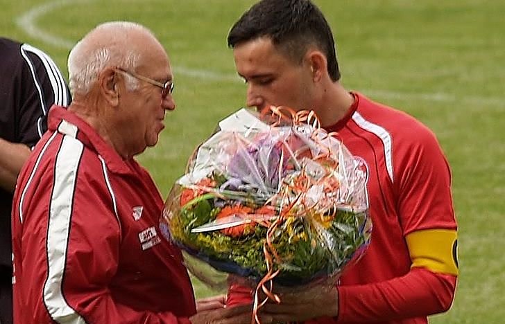 Verabschiedet wurde er vor dem Spiel gegen den VfB Artern vom Präsidenten Günter John, Schatzmeister Uli Theuerkauf und der gesamten Mannschaft und allen anwesenden Zuschauern.