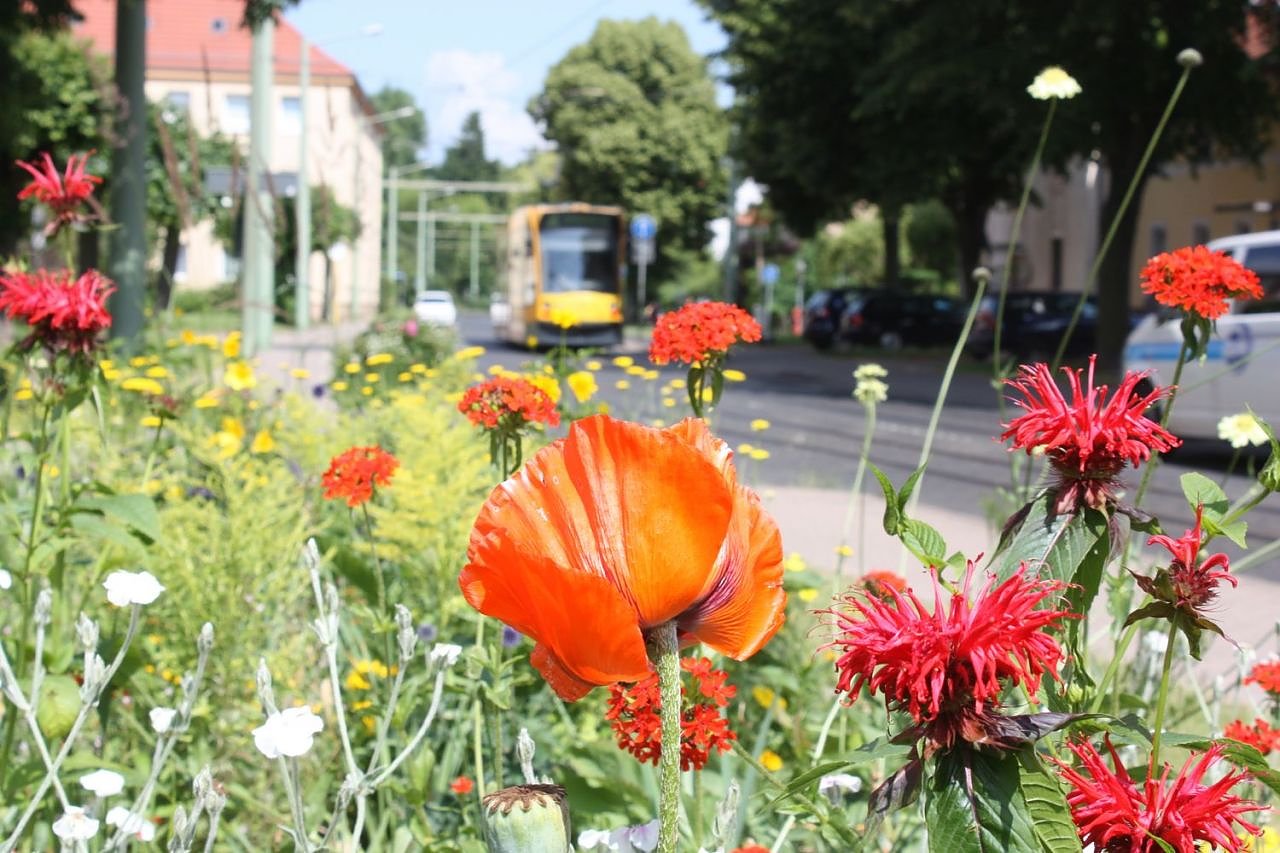 So wurde für die Verkehrsinsel an der Kreuzung Leimbacher Straße/W.-Nebelung-Str. eine von der Lehr- und Versuchsanstalt Gartenbau in Erfurt entworfene Staudenmischung namens Feuer und Flamme verwandt. Es handelt sich dabei um Gräser, Stauden und Blumenziebeln, die neben den robusten Wuchseigenschaften auch nach der Blühfarbe von rot über orange bis gelb zusammengestellt wurden.