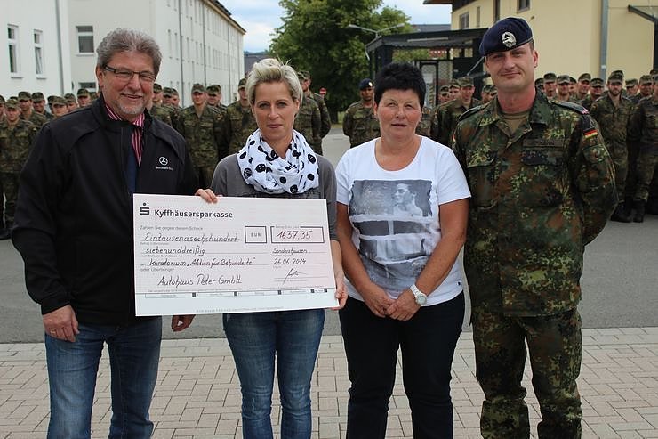 Im Auftrag der Autohaus Peter Gruppe aus Nordhausen übergab Claus Müller vom Autohaus Peter in Sondershausen im Beisein vom stellvertretenden Kommandeur des Feldwebelanwärter/-Unteroffiziersanwärter- Bataillons 1, Major Jan Ohrmann, an Grit Szemendera (li.) Leiterin der integrativen Kindertagesstätte Arche Noah in Sondershausen (Stockhausen) und der Geschäftsführerin des Kuratoriums für Behinderte in Nordthüringen, Regina Girschele den symbolischen Scheck.