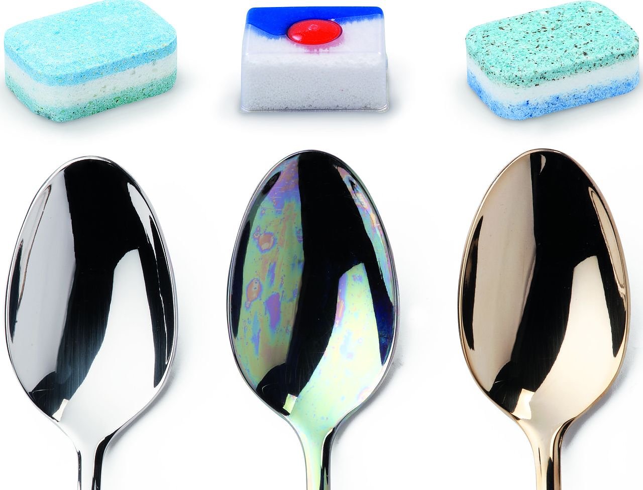 Autor: redDie Frosch Soda Geschirrspül-Multitabs machten aus silbernem Edelstahlbesteck goldenes. Eine Verfärbung, die sich auch durch Putzen nicht mehr entfernen lässt. Die Finish-Tabs sorgten für bunte Regenbogenfarben auf dem Besteck.