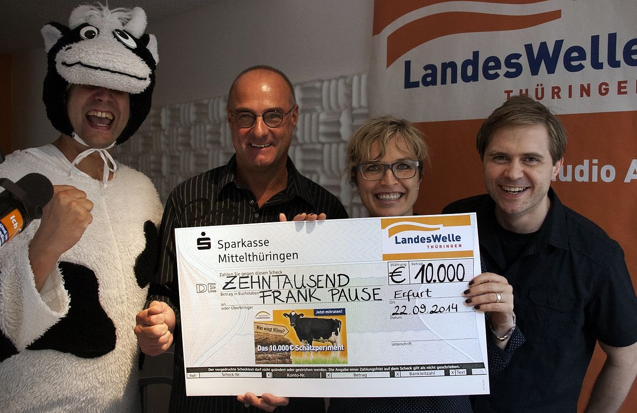 Weil er das Gewicht einer Milchkuh geschätzt hat, ist Frank Pause aus Nordthüringen um 10.000 Euro reicher. Der 49-jährige Außendienststellen-Leiter einer Behinderteneinrichtung hat am Montagmorgen das 10.000 Euro Schätzperiment beim privaten Radiosender LandesWelle Thüringen gewonnen...