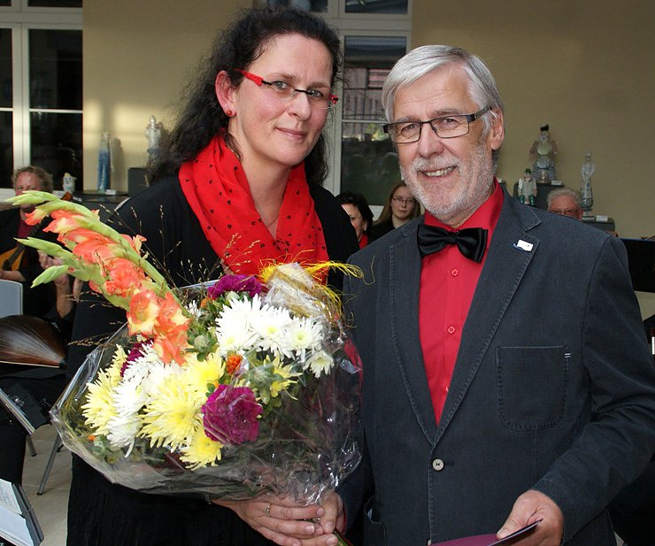 Autor: khhIm Rahmen des Konzertes Rhapsodien des Landeszupforchesters Thüringen, welches am 5. Oktober 2014 in der Porzellanmanufaktur in Rudolstadt stattfand, wurde die Ehrennadel des Landesmusikrates durch die Vizepräsidentin des Landesmusikrates Thüringen, Daniela Heise, an Herrn Hannes Grübler verliehen. Mit dieser Ehrennadel möchte der Landesmusikrat Persönlichkeiten ehren, die sich in besonderer Weise für die Arbeit und im Sinne des Landesmusikrates Thüringen eingesetzt haben.