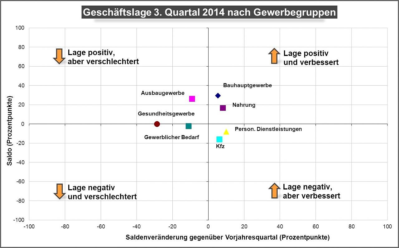 Geschäftslage:Die aktuelle Einschätzung der Geschäftslage ist im dritten Quartal 2014 auf 87,2 Punkte kräftig gestiegen. Nur 12,8 Prozent der Betriebe beschreiben ihre aktuelle Geschäftslage als schlecht. Dies sind weniger Betriebe als im gleichen Quartal des Vorjahres mit 14,1 Prozent. Die aktuelle Geschäftslage wird sogar besser eingeschätzt als die Erwartung für das kommende Quartal. Hier rechnen 85,9 Prozent mit einer positiven Geschäftsentwicklung. Somit könnte die aktuelle Geschäftslage die Spitze des konjunkturellen Wachstums im Handwerk im Jahr 2014 darstellen. Die positive Entwicklung der Geschäftslage wird vor allem durch die Baugewerbe, Kfz-Gewerbe, personenbezogene Dienstleistungen sowie das Nahrungsgewerbe getragen.