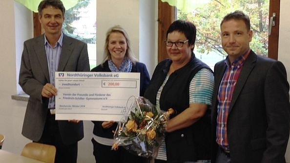 Heute erhielt der Verein der Freunde und Förderer des Friedrich-Schiller-Gymnasiums in Bleicherode aus den Händen von Melanie Ahrend von der Nordthüringer Volksbank einen Scheck über 200 Euro für die Auffrischung des schuleigenen Speiseraums.
