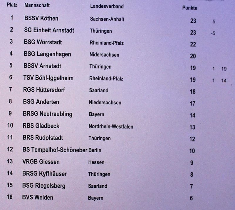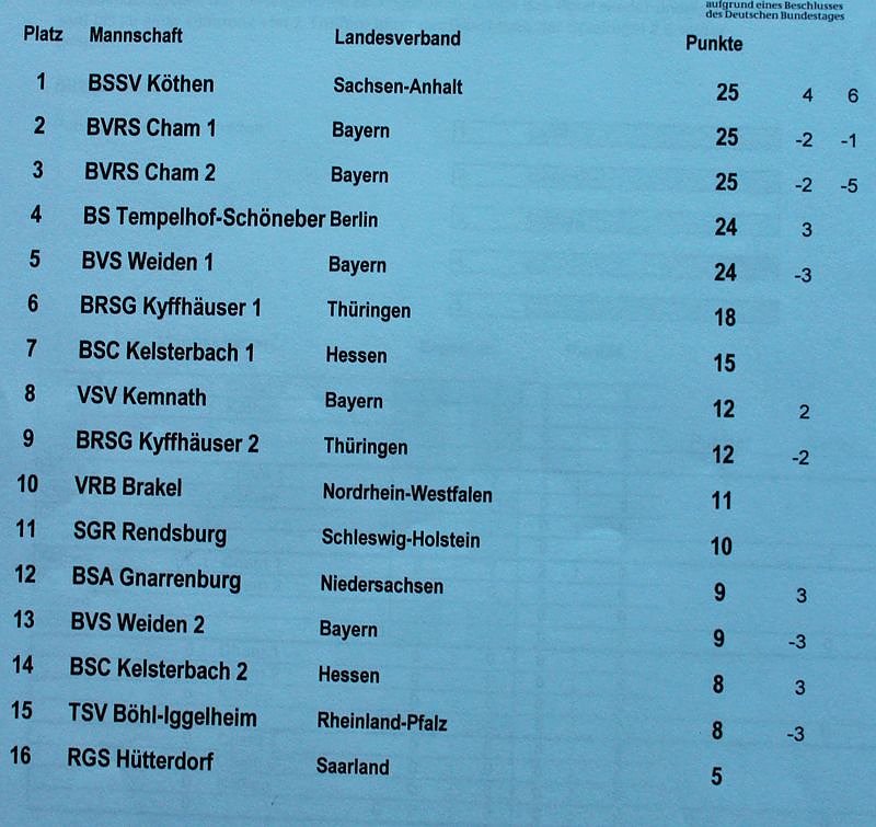 Heiß begehrt waren die Trophäen für diese Deutsche Meisterschaft. Und bei den Männern ging es mehr als knapp zu, bevor die Mannschaft des BSSV Köthen (Sachsen-Anhalt) als Meister feststand. Punktgleich mit 25 Punkten musste sich die Mannschaft des BVRS Cham I geschlagen geben, wie die Übersicht zeigt.