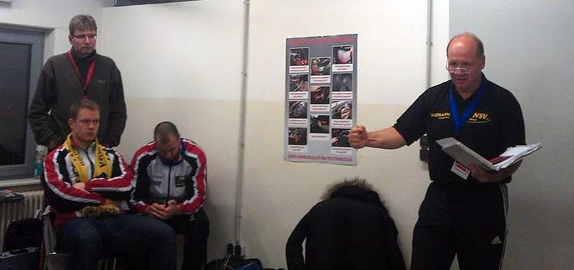 Zum Bild: Cheftrainer Andreas Dietrich-Scherfling schwört die Mannschaft auf sieben kräftezehrende Kämpfe ein: "Wir müssen nicht 100, nicht 150, sondern 200% geben um zu gewinnen. Wir wollen die Punkte!"