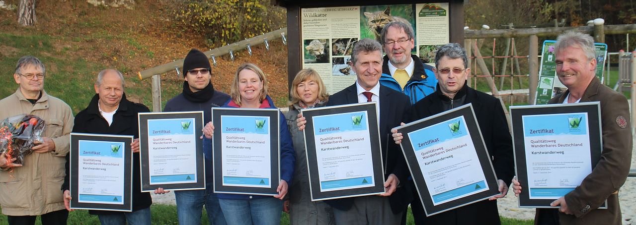 Der "Förderverein Karstwanderweg" ist auch im "Harzclub" vertreten und hat erheblichen Anteil am Erfolg. Es ist vor allem den Naturenthusiasten zu verdanken, dass die Schilder zu Themen wie Wildkatze, Fledermaus und traditioneller Waldwirtschaft nun ihren Platz entlang des Karstes gefunden haben. Aber auch die Zertifizierung als Qualitätsweg, die erst mit September erneuert werden konnte, haben die Förderer vorangetrieben. Entsprechende Urkunden wurden vom Vorsitzenden des Vereins Andreas Heise, und seine Stellvertreterin Frau Dr. Sabine Mehne an die Bürgermeister der angrenzenden Gemeinden übergeben.