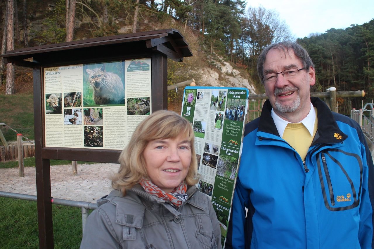 Der "Förderverein Karstwanderweg" ist auch im "Harzclub" vertreten und hat erheblichen Anteil am Erfolg. Es ist vor allem den Naturenthusiasten zu verdanken, dass die Schilder zu Themen wie Wildkatze, Fledermaus und traditioneller Waldwirtschaft nun ihren Platz entlang des Karstes gefunden haben. Aber auch die Zertifizierung als Qualitätsweg, die erst mit September erneuert werden konnte, haben die Förderer vorangetrieben. Entsprechende Urkunden wurden vom Vorsitzenden des Vereins Andreas Heise, und seine Stellvertreterin Frau Dr. Sabine Mehne an die Bürgermeister der angrenzenden Gemeinden übergeben.Die beiden bedankten sich ausgiebig bei allen Beteiligten, für die Unterstützung, die der Verein in seiner Arbeit erhält. Die ist nicht nur ideel, etwa bei der Recherche zu den Inhalten der Informationstafeln, sondern auch Handfest, wie beim Aufstellen der Schilder.