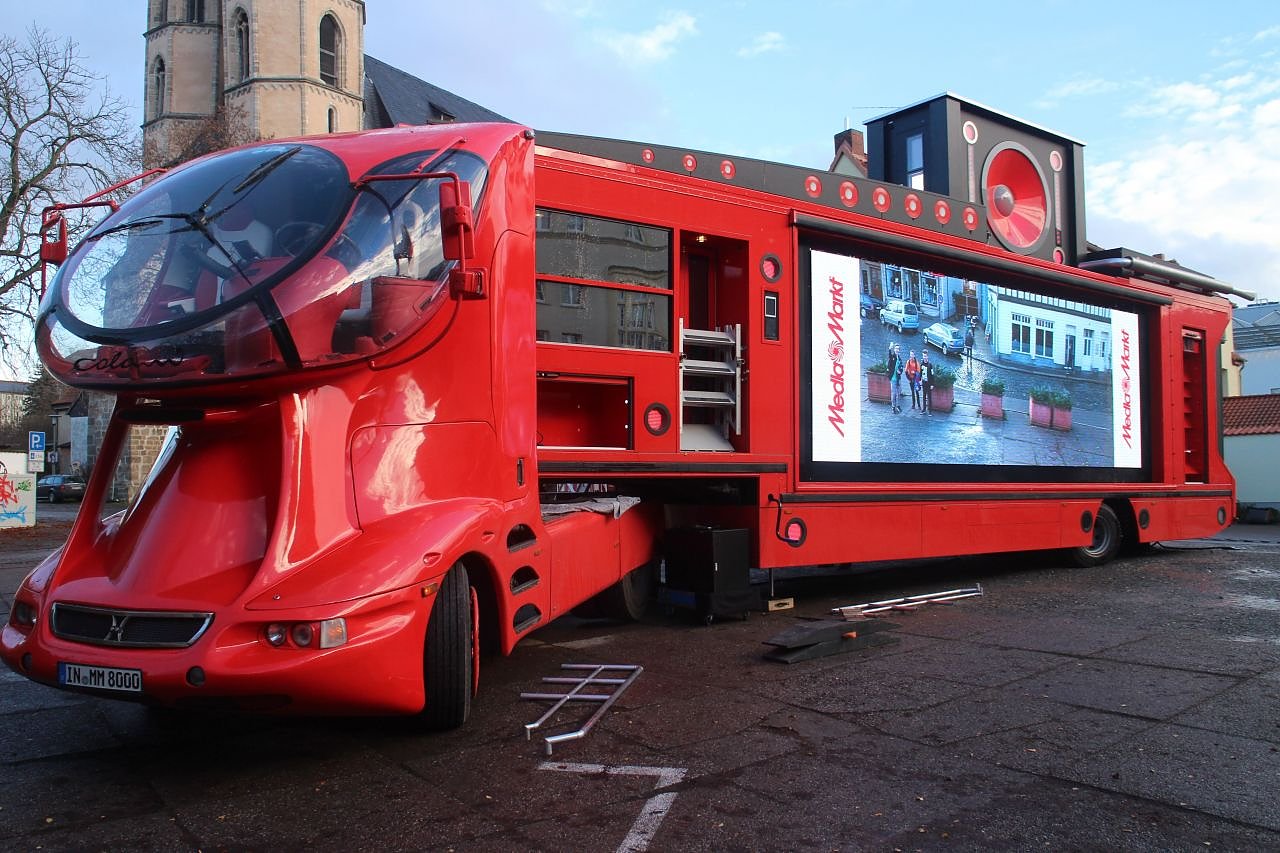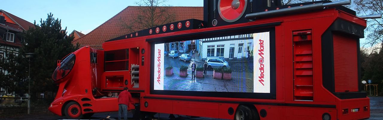 Aber das Motto "größer ist besser" zieht ja heutzutage nicht mehr. Laut muss es auch sein. Und bunt. Mit vielen Leuchtelämpchen. Aus den Lautsprechern tönen beständig die bekannten Werbebotschaften des Konzerns. Die Reaktion der Passanten auf den roten Werbetruck reichten von "Oh, super" bis "Hmm, seltsam". Im Laufe des Tages soll das Ungetüm mit verschiedenen Waren des Marktes bestückt werden. Die Aufmerksamkeit wird dem Elektronikriesen gewiss sein. Aufgabe erfüllt.
