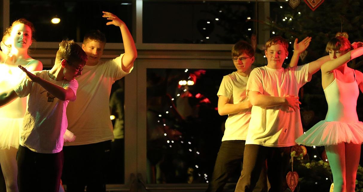 Neben besinnlichen Weihnachtsliedern und Tänzen wurden auch heitere Beiträge dargeboten. Der Kurs Hauswirtschaft hatte Plätzchen gebacken, Schülerarbeiten aus dem Kunstunterricht konnte man als Kalender erwerben, gespendete Bücher fanden neue Besitzer.