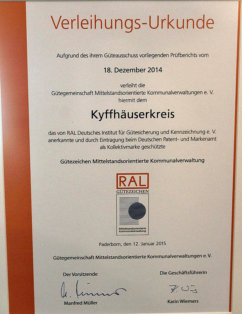 Das RAL-Gütezeichen zeigt Signalwirkung und informiert die Firmen, dass hier ein wirtschaftsfreundliche Kommune am Werke ist. Durch die TÜV NORD CERT GmbH wurde jetzt das Prüfergebnis vorgelegt, ob alle Kriterien des Gütezeichen erfüllt wurden. Die Prüfer kamen im Dezember 2014 zu der Einschätzung, dass die Voraussetzungen für die seit mehreren Jahren angestrebte Zertifizierung erfüllt sind.