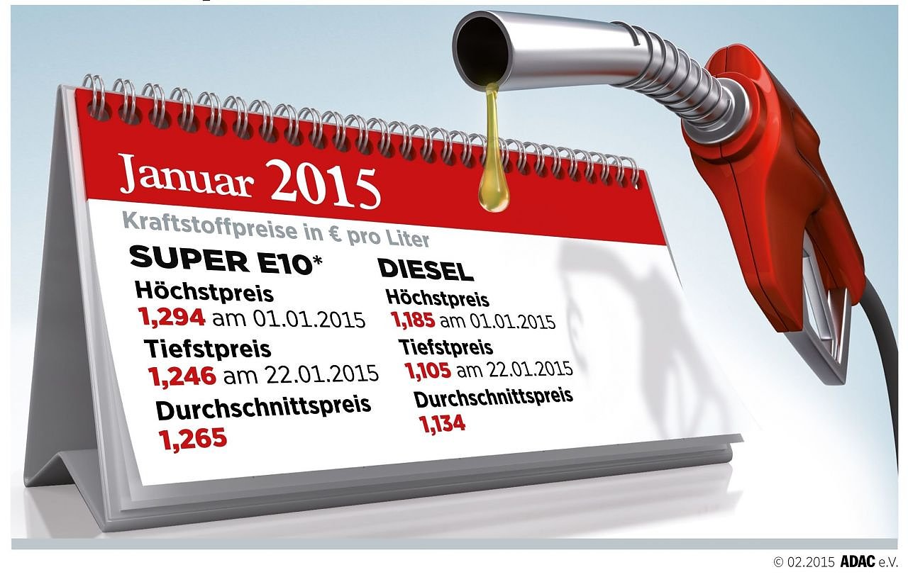 Damit war der Januar 2015 der günstigste Monat für die Fahrer von Benziner-Pkw seit April 2009. Damals kostete der Liter Benzin im Monatsmittel 1,235 Euro.