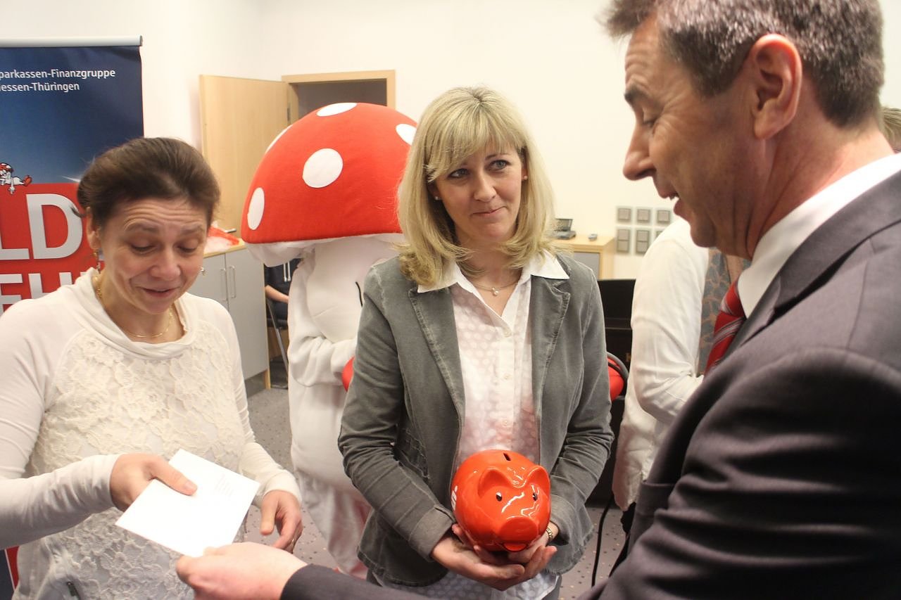 Sparkassenchef Wolfgang Asche übergab die roten Sparschweine an die Gewinner (Foto: Angelo Glashagel)