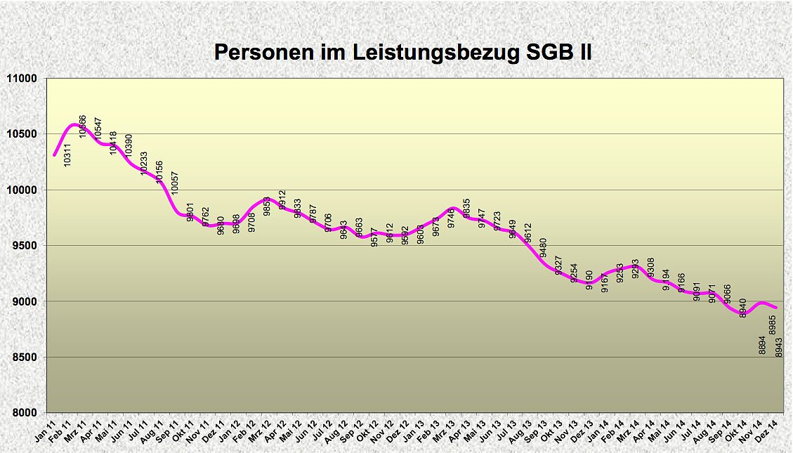 Für 2014 hatte man mit dem Bund vereinbart, 25,2% der Kunden des Jobcenters wieder in Arbeit zu integrieren. Mit 24,9% bliebt man knapp unter dieser Marke. Insgesamt 1657 Personen fanden wieder eine Beschäftigung, die mit mindestens 451 Euro vergütet wurde und somit sozialversicherungspflichtig war. Gut 60% dieser Personen fand für mehr als sechs Monate eine Anstellung.
