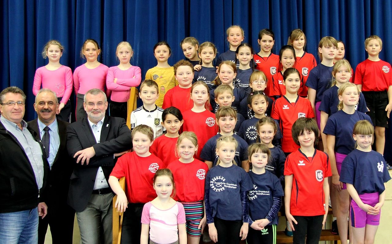 Im Beisein des 2. Beigeordneten des Landratsamtes, Stefan Nüßle kämpften acht Mannschaften aus fünf Grundschulen um die Urkunden das Staatlichen Schulamtes Nordthüringen. Der Mannschaftssieg ging nach einem packenden Mannschaftsvierkampf am Boden, Barren, Reck und Sprung an die Grundschule Bertolt Brecht.