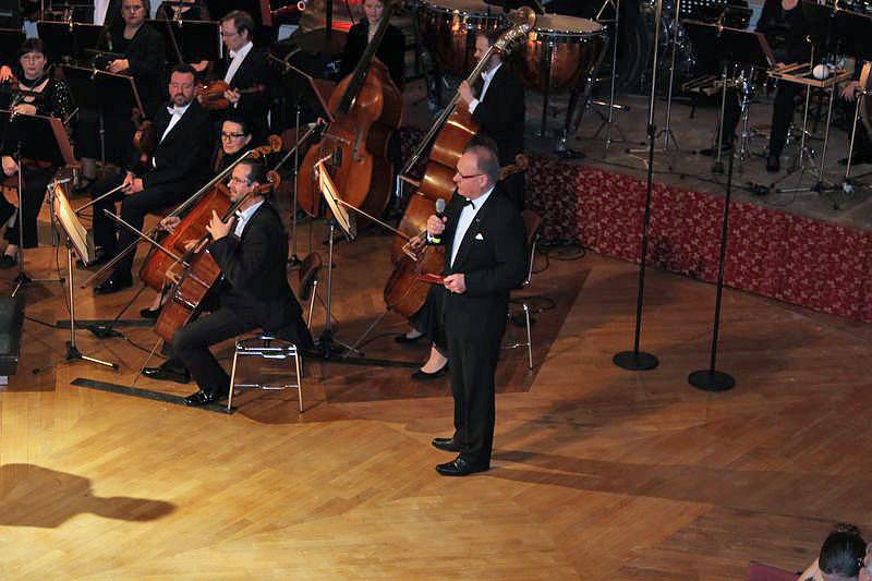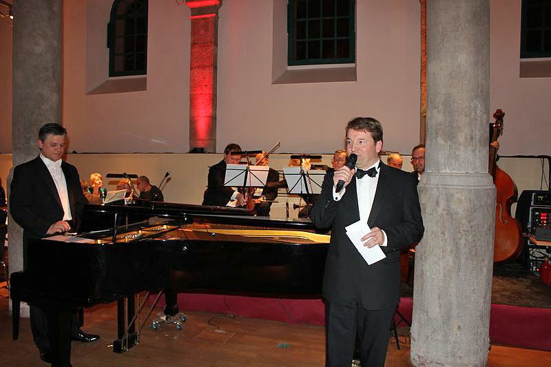 Während die einen noch tanzten, übernahm Lars Tietje im Marstall die Begrüßung der Gäste. Ohne Dirigent kam im Marstall das Salonorchester aus, mit Markus L. Frank dafür am Klavier.