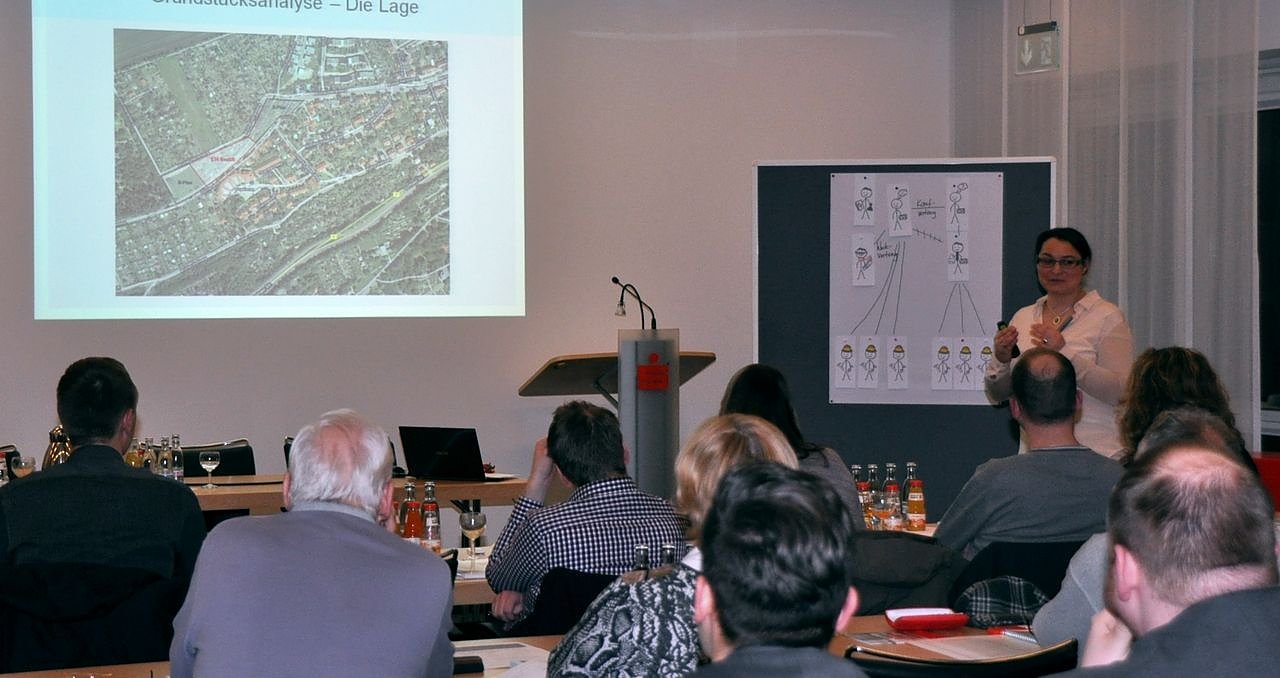 Der Vortrag thematisierte all die Details, die auf dem Weg in die eigenen vier Wände zu bedenken sind. Die erfahrene Architektin und Dozentin des Abends, Ines M. Jauck, gab wertvolle Informationen über die richtige Auswahl von Grundstücken, Hinweise zu Bebauungsplänen sowie zu Kostenfallen, die bereits bei der Grundstückswahl zu vermeiden sind. Auch die Vorstellung der Möglichkeiten zum Bau mit einem Architekten oder einem Bauträger lieferte den Seminarteilnehmern wertvolle Tipps im Hinblick auf einen Planungs- und Bauprozess.