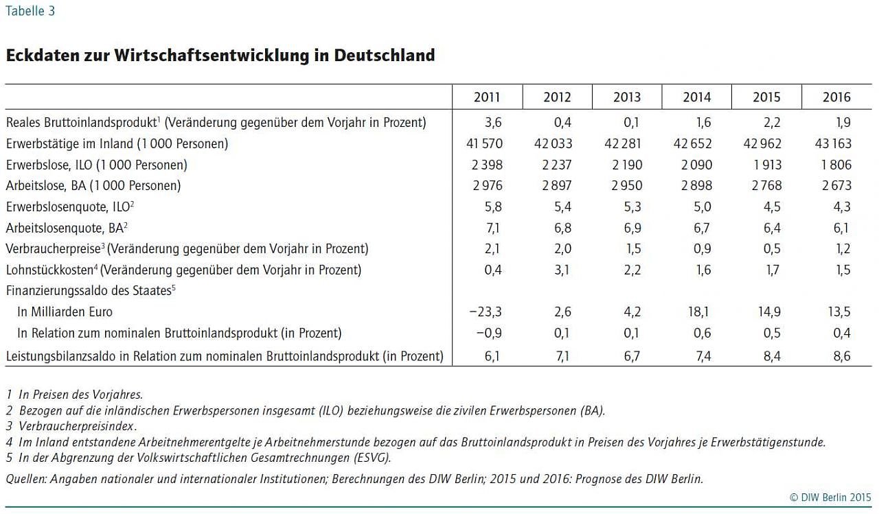 Für 2015 rechnen die Experten mit rund 300.000 zusätzlichen Jobs und einer Arbeitslosenquote von 6,4 Prozent, für kommendes Jahr mit rund 200.000 neuen Stellen und einer Quote von 6,1 Prozent. Die befürchteten negativen Beschäftigungswirkungen des Mindestlohnes sind bislang ausgeblieben. Die Löhne dürften weiter spürbar steigen und die Leistungsausweitungen im Bereich der Rentenversicherung sorgen vorübergehend für einen kräftigen Einkommensschub; beides kurbelt den Konsum zusätzlich an. Kaufkraftsteigernd wirke auch der deutlich gesunkene Ölpreis: Die privaten Haushalte werden nach DIW-Einschätzung die entstandenen Spielräume zumindest zum Teil für andere Konsumausgaben nutzen. Die Inflationsrate dürfte in diesem Jahr bei 0,5 Prozent liegen, im kommenden Jahr bei 1,2 Prozent.