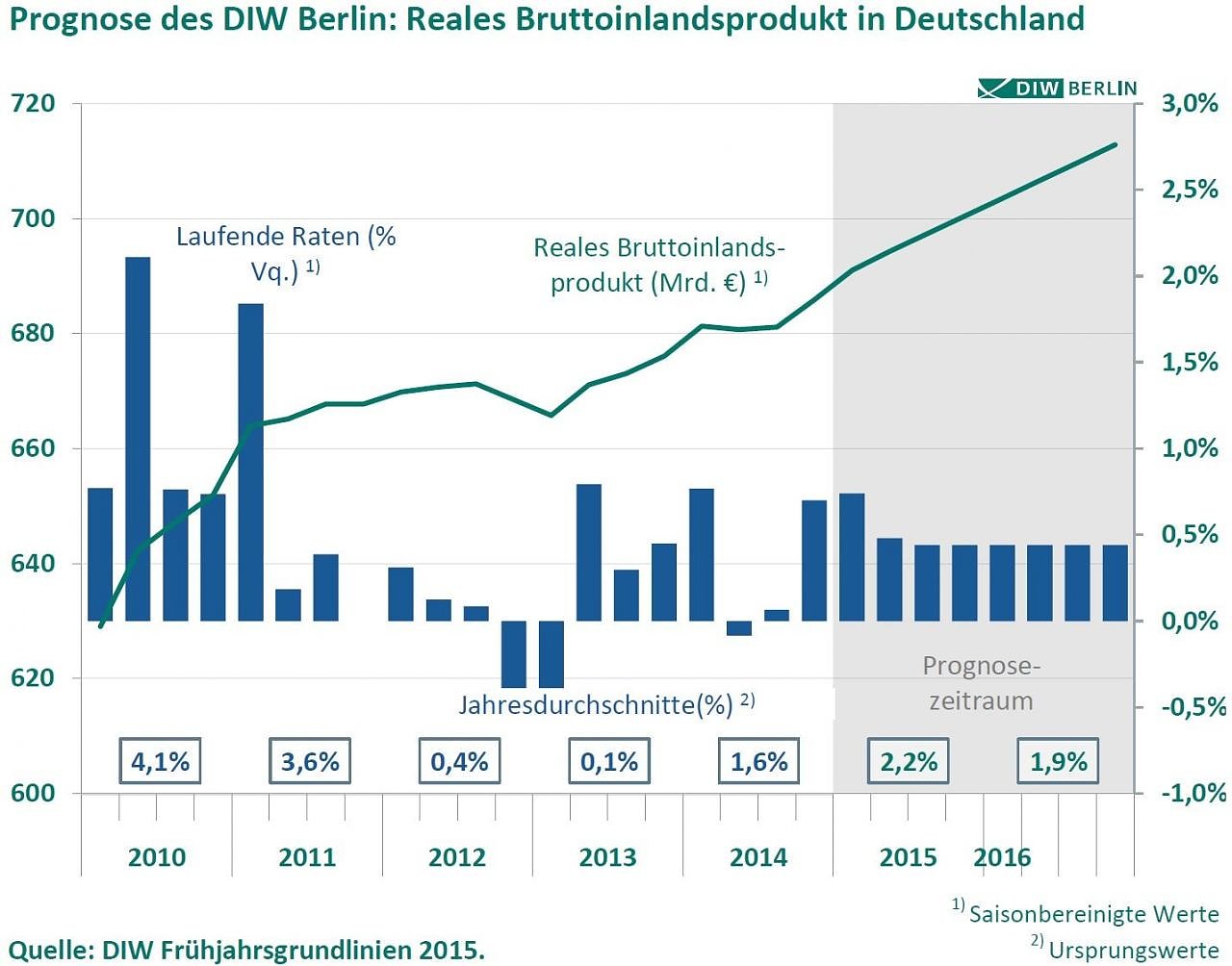 Die deutsche Wirtschaft dürfte nach einem kräftigen ersten Halbjahr 2015 ihre Produktionskapazitäten nahezu auslasten und dann mit Raten zulegen, die ihrem Potenzialwachstum entsprechen. Getragen wird das Wachstum in erster Line vom privaten Konsum, vor allem gestützt auf den Arbeitsmarkt, wo sich der Beschäftigungsaufbau fortsetzt.
