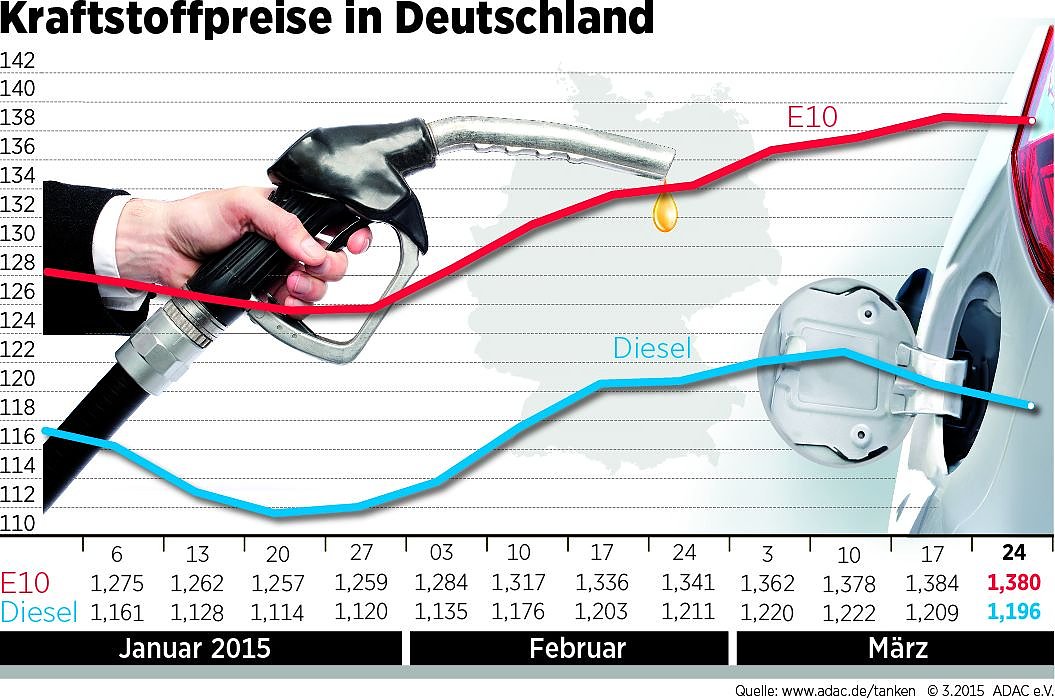 Noch deutlicher ist der Dieselpreis gefallen: Ein Liter kostet laut ADAC im Schnitt 1,196 Euro und somit 1,3 Cent weniger als vor Wochenfrist. Der Club empfiehlt den Autofahrern, angesichts der in Kürze beginnenden Osterferien vor dem Tanken die Preisbewegungen an den Zapfsäulen zu beachten und gezielt bei günstigen Gelegenheiten nachzutanken.
