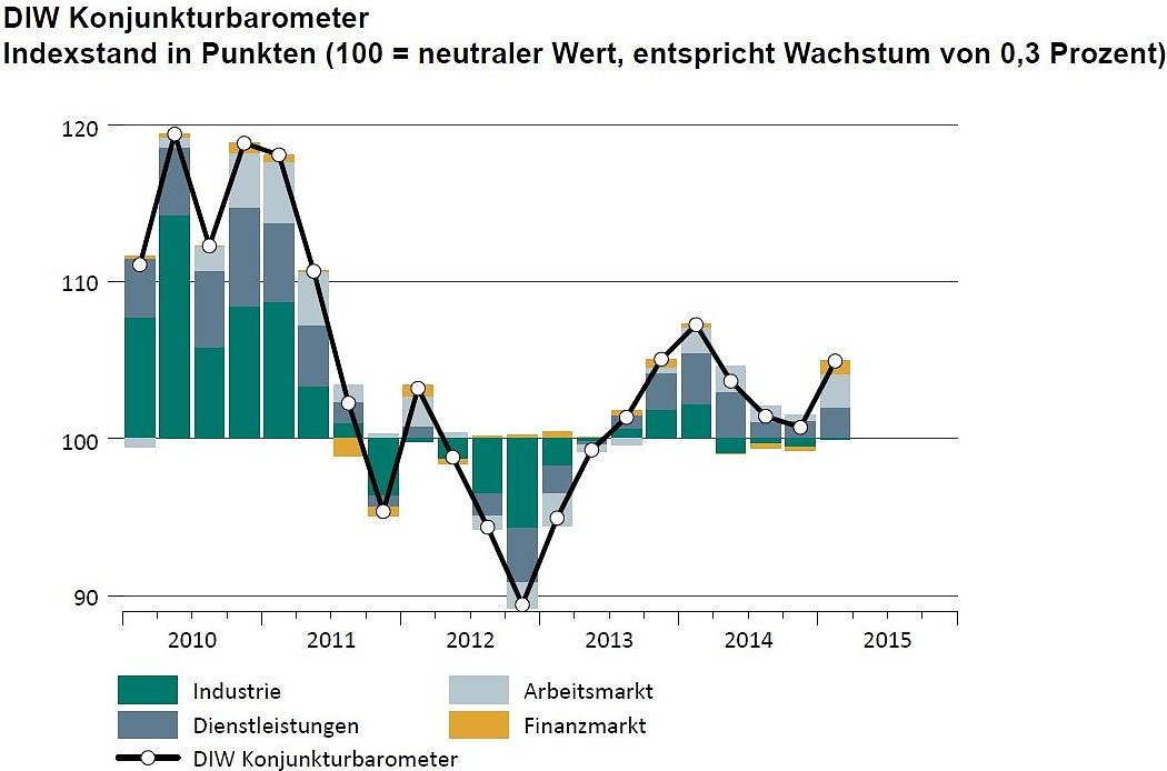 Die deutsche Wirtschaft dürfte das Tempo des bereits kräftigen Schlussquartals 2014 im laufenden Vierteljahr halten. Darauf weist das Konjunkturbarometer des Deutschen Instituts für Wirtschaftsforschung (DIW Berlin) hin, das einen Anstieg des Bruttoinlandsprodukts um 0,7 Prozent gegenüber dem Vorquartal anzeigt...