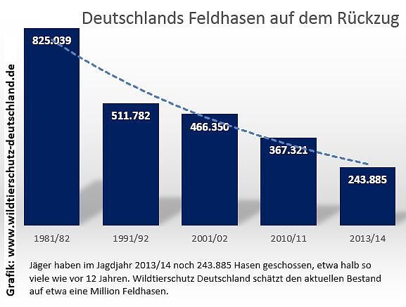 Ein Indiz für den rasanten Rückgang der Hasenbestände sind die aktuellen Abschusszahlen der Jäger. Während in den 1980er Jahren noch über 800.000 und vor 10 Jahren noch etwa 500.000 Hasen auf deutschen Fluren getötet wurden, so waren es im Jagdjahr 2013/14 gerade nochmal 244.000 Langohren, die durch Jäger gestreckt wurden. Unterstrichen wird dieser Fakt durch rückläufige Fallwildzahlen (durch Verkehrsunfälle umgekommene Hasen).